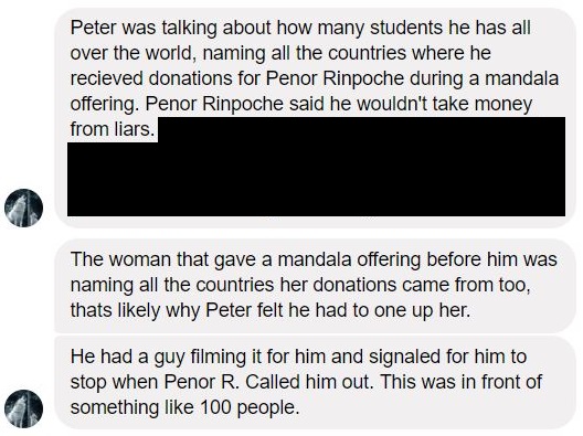 ‘Aside from his first name, the only thing I ever heard Penor Rinpoche call Peter was a liar. This was during the summer retreat, where Rinpoche said he did not “take money from liars”, and refused Peter’s monetary offering in front of the entire group of retreatants.’