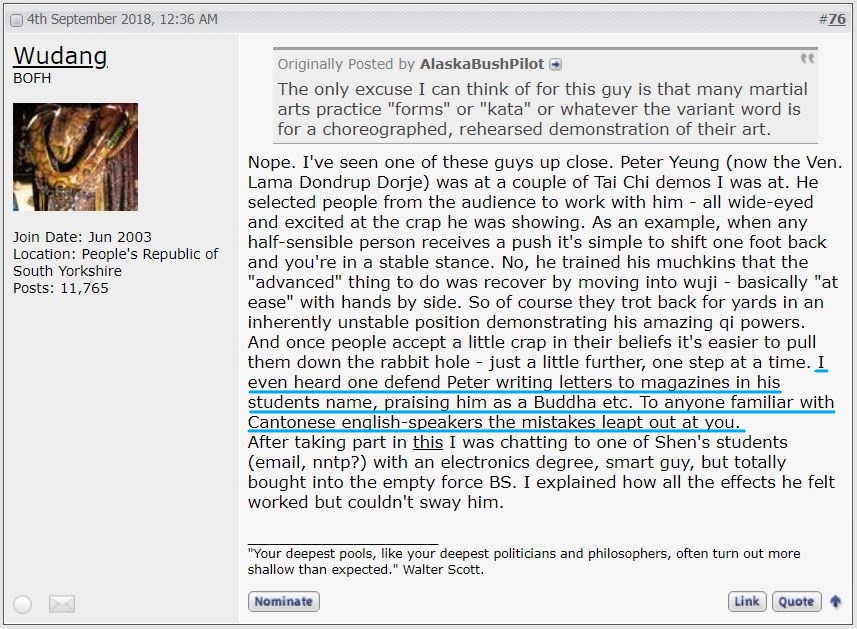 Notably, PY instructed these sections to be removed in 2012, as he evolved his persona from martial artist to full-fledged Buddhist teacher — I was around when this happened.